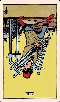 The Ten of Swords tarot card upright shows a man lying face down with ten swords stabbing his back. The knight of swords is usually represented by a young warrior charging into battle on the back.